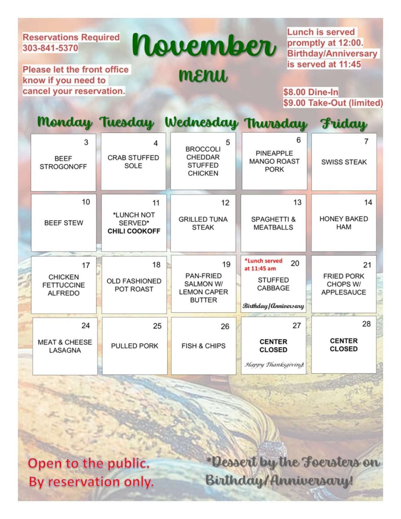 Dine in meals cost $8.00 and are open to anyone, including non-members and guests.