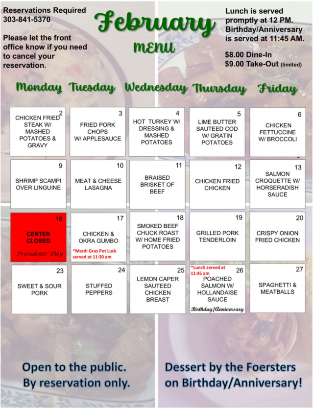 The everyday cooked lunch program…planned, purchased, and magnificently prepared by a professional chef who has been so engaged for almost ½ century, is an absolute highlight function/service provided by the Parker Senior Center. Not only is the menu delightfully diversified, but each day – at a beyond most modest competitive price – the luncheon offerings is always complete with a delicious protein, carbohydrate, vegetable, and dessert selection. In short, the daily choice is selectively complete. For many attendees, the Parker Center Senior is the sole comprehensively solid meal of the day; this is as a direct result of some alternate inability to self-prepare adequate meals at home or elsewhere, but likewise- importantly- for countless other frequent or regular luncheon attendees, the Parker Senior Center prepared, cooked, and served full luncheon constitutes a social dynamic otherwise absent from one’s daily reality. To summarize, with little fanfare and limited widespread publicity, the daily “home cooked” luncheon program offered through Parker Senior Center is a beyond critical nutritious, social, and connecting invaluable public services offered to and for the population of Douglas County and surrounding area environs.